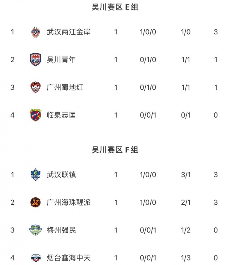 4日讯 据中冠联赛官方报道,中冠联赛大区赛结束多场争夺。其中,武汉联-1烟台鑫海中天、临泉志-1武汉两江金岸、梅州强-2广州海珠醒派、广东吴川青-1广州花都蜀地红。